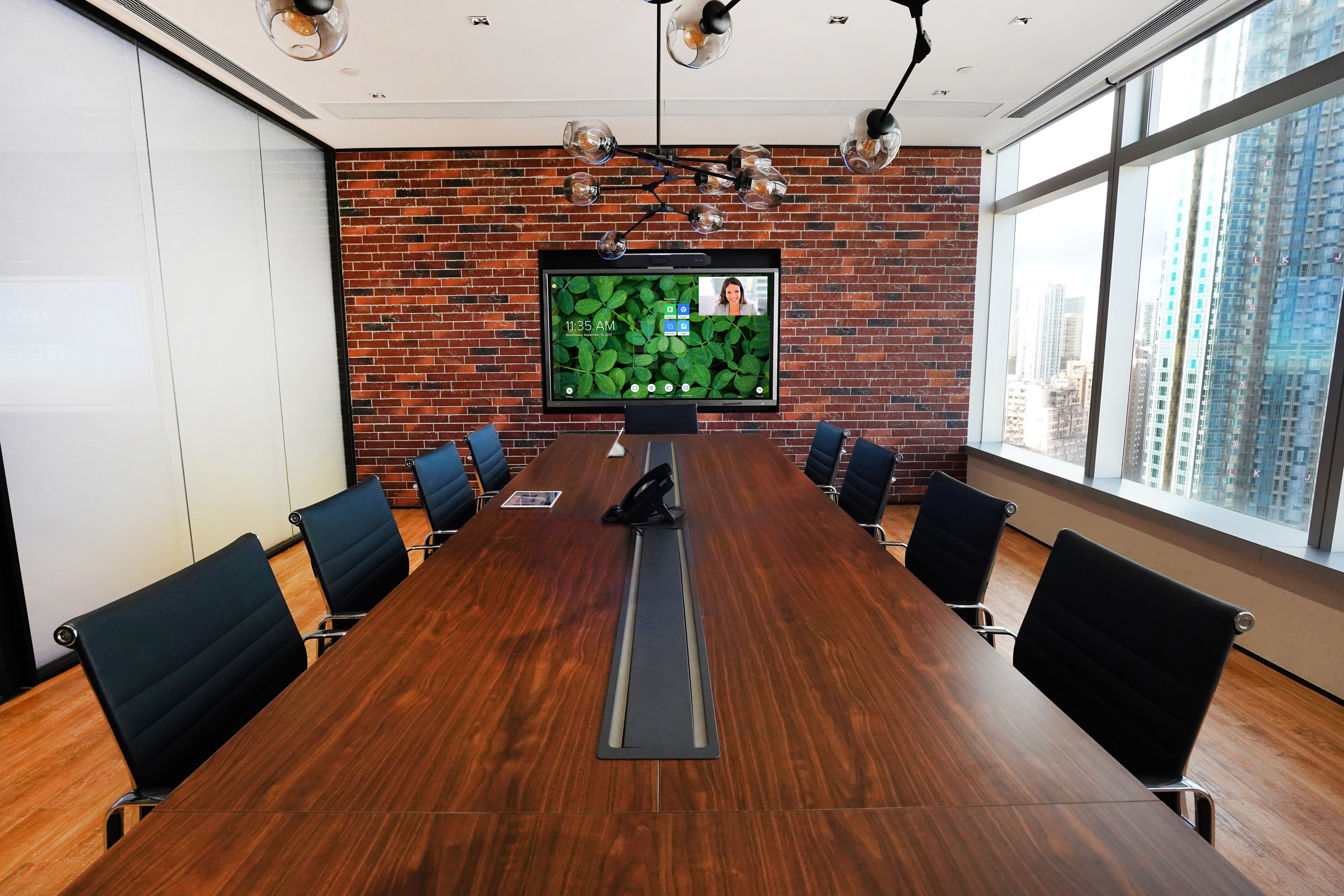 In the Conference Room, video and data collaboration is made simple by deploying Poly Studio X50 all-in-one video bar which comes with a TC8 touch controll panel for instant set-up of remote meetings. To enhance engagement in meetings, interactive LCD display is deployed with which participants can draw and highlight on shared content. In meeting rooms and huddle space, content sharing and video collaboration facilities are built-in to realize collaboration anywhere.